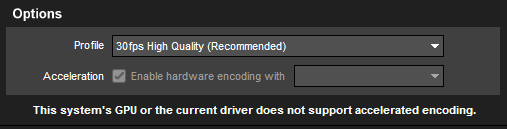 Drivers must be relatively up to date for this feature to be available in ProShow. Older drivers may result in a message that says “This system’s GPU or the current driver does not support accelerated encoding.” Please see your graphics card manufacturer’s website for the latest driver downloads.