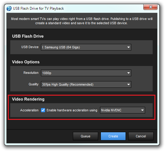 An important note about hardware encoding is that ProShow relies on the capabilities that are hardcoded into the graphics card itself. The resultant videos may not be as optimized in terms of the size-to-quality ratio as they would with the software encoder. This is more true for videos created with Intel GPUs than with those created from Nvidia GPUs. For most users, this tradeoff should be fine, but if achieving the smallest file size is important, you may want to uncheck the acceleration option prior to creating your video. Additionally, the limitations of the GPU’s hardware encoder mean that this option isn’t available for all formats.